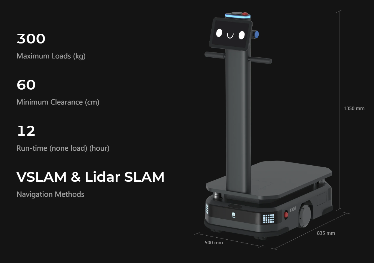 While the T300 handles most internal logistics needs, the PUDU T600 is designed for heavier-duty warehouse transport.